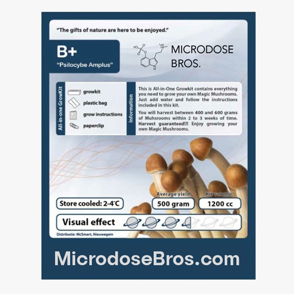 The B+ Magic Mushroom Grow Kit allows you to cultivate your own large, potent mushrooms at home. Known for its impressive size, vibrant visuals, and euphoric experiences, B+ is one of the most beginner-friendly and high-yielding Psilocybe cubensis strains.